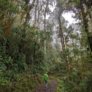 We left the viper behind, soon arriving at the halfway point, which was supposed to be open, with coffee and snacks, but to our disappointment, was closed. The trail only got steeper from that point on, and the forest rapidly changed into a type of forest I have never seen before. Full of huge evergreen oaks carrying hundreds of pounds of epiphytes in their tall branches, and covered with long, wavy, yellow green moss, the forest felt ancient. In contrast, the path was lined with bright almost neon green moss, as if lighting the way in the now eerie, cloudy atmosphere. This section of the trail was aptly named “Barbas de Viejo,” or, “Old mens’ ' in english, for the long beard like moss blanketing the oaks.